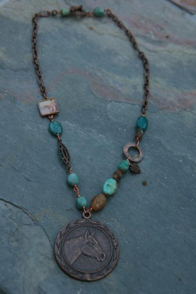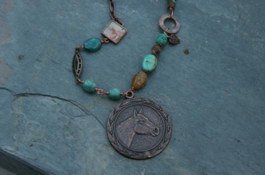 A unique copper equestrian medal hangs from beads of Chrysoprase,Turquoise, and
