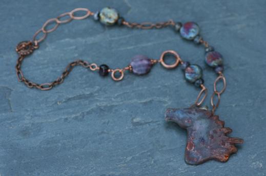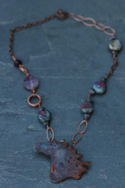 Beautiful Raku horse head by Flamin' Turtle Raku hanging from a mix of Sugilite,